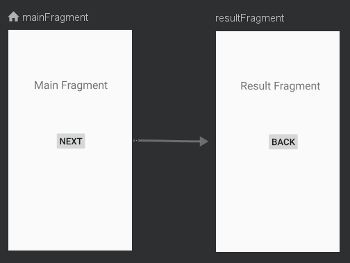 프래그먼트를 추가하고 Action을 지정한다. Main 프래그먼트에서 Result 프래그먼트를 이어준다.