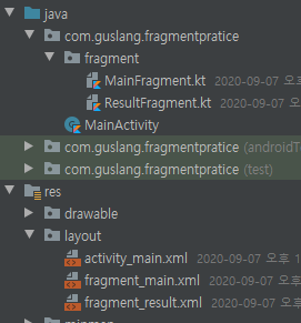 : fragment 간 이동 확인을 위해 main, result 2개 생성하고, java와 res디렉토리에 관련 파일들이 생성되었는지 확인한다.