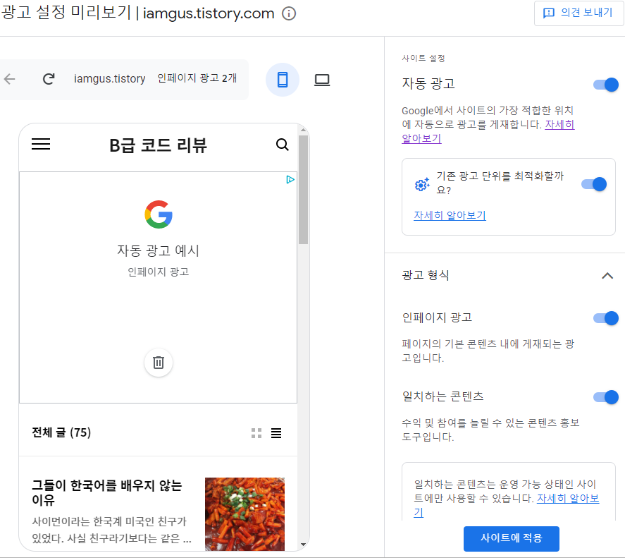승인 메일을 받자마자 애드센스 페이지로 이동하여 사이트에 접속했는데 광고가 전혀 나오지 않았다. '아직 반영 중인가?' 애드센스 관리 페이지를 보니 사이트별로 광고 설정이 제대로 되어 있지 않아 아래와 같이 설정하고 사이트 적용을 하니 정상적으로 광고게 게재되었다.