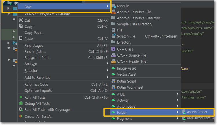 3. 안드로이드 스튜디오 asset 폴더 생성