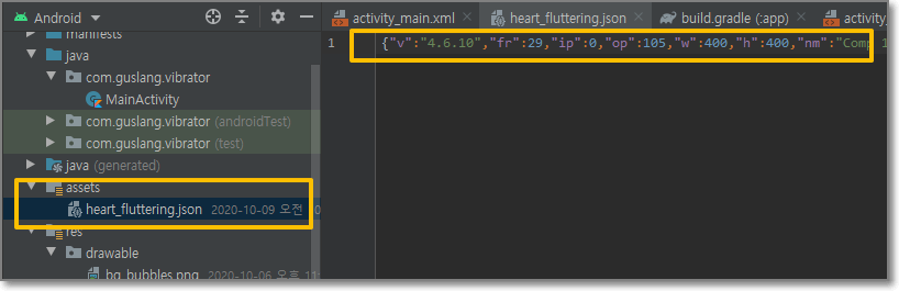 - app:lottie_fileName="heart_fluttering.json" -- 애니메이션 파일명