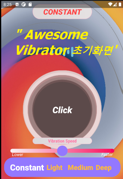 Vibrotor는 하나의 Activity로 구성이 되어있다. 가운데 진동 버튼은 Lottie에서 무료로 다운받았다. 4가지 진동 모드 선택이 가능하고 SeekBar를 통해 스피드를 조절할 수 있다.