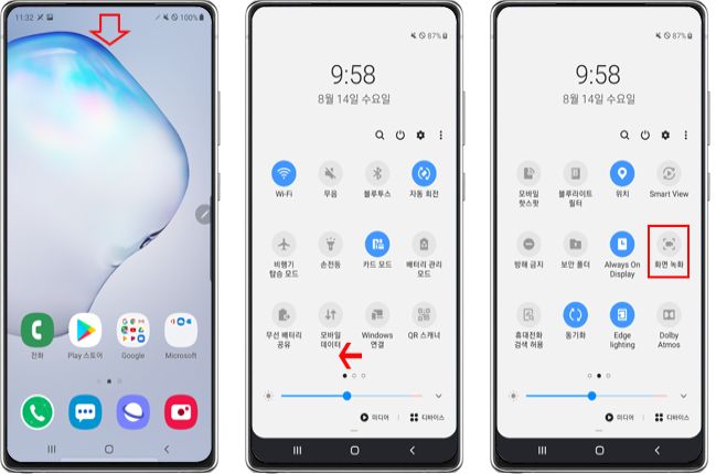 ① 상단바를 아래로 내린후 ② 알림창을 왼쪽으로 밀어 ③ 화면 녹화 기능을 켜세요. 3초 후 화면 녹화가 시작됩니다.