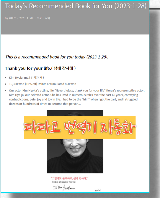 재능마켓에 블로그 자동화에 대한 전자책을 판매하면서 여러 가지 질문을 받습니다. 고객의 니즈를 파악하고 문제점을 개선할 수 있는 시간입니다. 최근 파파고 자동 번역해 티스토리에 자동 게시할 수 있는지 문의가 왔습니다.