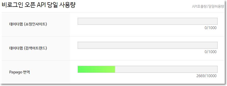 2. API 사용 승인을 받으면 Client ID, Client Secret 정보가 생성됩니다. 파파고 번역 API호출 시 필요합니다. 이용량 제한도 있으니 노출되지 않도록 잘 관리해야 합니다. Papago 번역으로 한 번에 번역할 수 있는 분량은 최대 5,000자이며, 하루 번역 처리 한도는 10,000자로 제한이 있습니다. 무분별한 사용을 막기 위한 조치 같습니다.