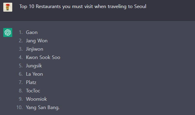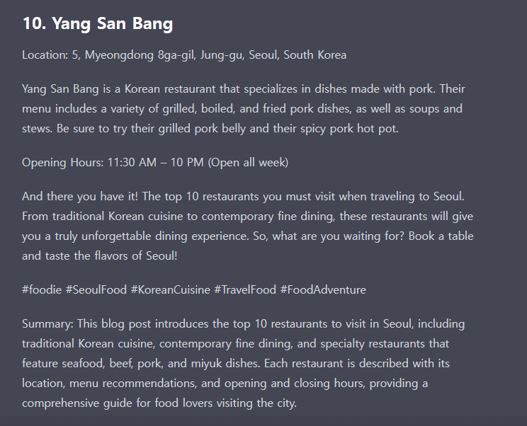 - 블로그의 주제를 '서울 여행 시 꼭 가봐야 할 맛집 10선'으로 작성한다.
