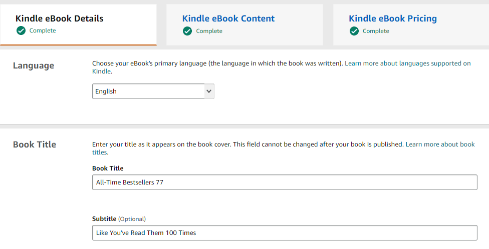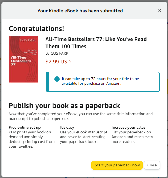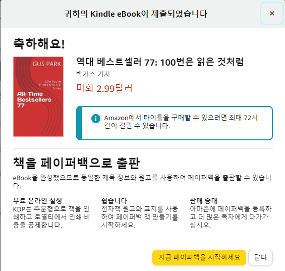 이상으로 아마존 킨들에 책을 출판해 보았습니다. 아이디어 기획부터 ChatGPT로 세부 내용 작성 그리고 KDP사이트에 책을 등록하고 판매하는 일련의 과정을 정리했습니다. AI를 이렇게도 이용할 수 있구나하는 경험을 하는 게 주요 목적입니다. 사실 판매는 기대하고 있지는 않습니다. 그래도 혹시나 ㅎㅎㅎ 실제 판매로 이어질까요? 저도 궁금합니다. 이건 다음 포스팅에 작성해 볼게요.