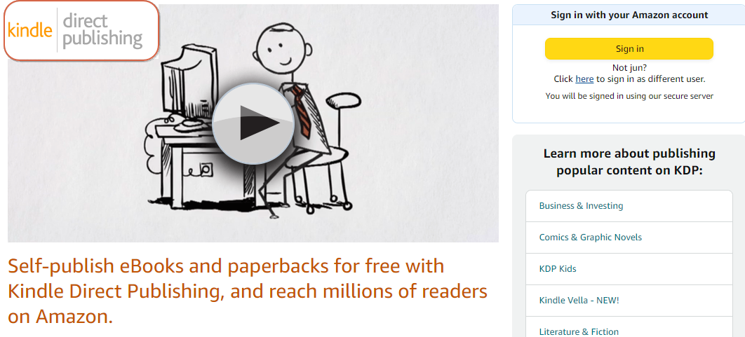 아마존 킨들 퍼블리싱 사이트에 접속합니다. (https://kdp.amazon.com/)