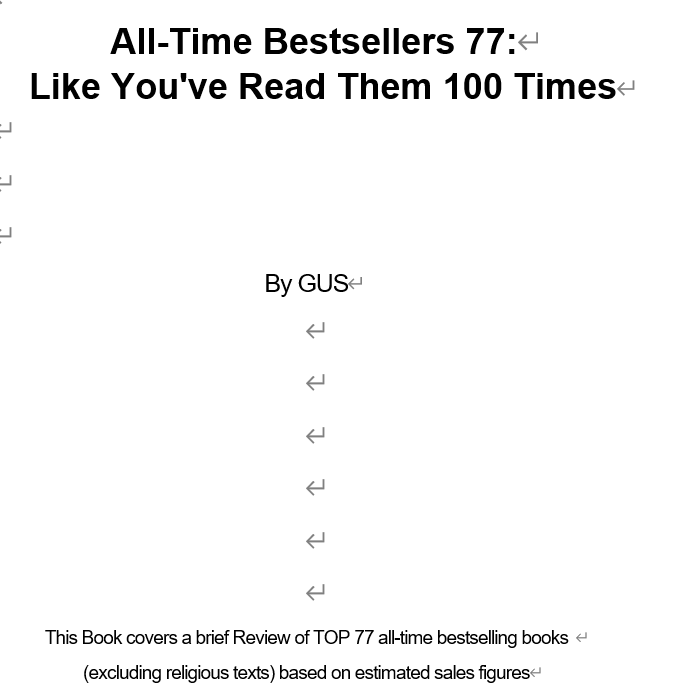가장 손쉽게 출판할 수 있는 주제를 찾아 등록해 보기로 합니다. 종합 베스트셀러 100권을 추출해 요약집을 만들어 볼 생각입니다. 책 제목은 "All-Time Bestsellers 100:Like You've Read Them 100 Times"입니다. 번역하면 "역대 베스트셀러 100권을 마치 100번 읽은 것처럼 만들어 주는 책"입니다. 의미심장하죠?