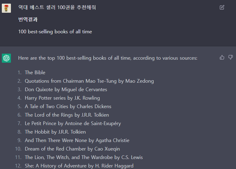 ChatGPT에 역대 베스트셀러 100권을 추천해 달라고 합니다. 작가와 책 제목 목록을 보여줍니다. 이제 각 항목별로 상세 내용만 요약해 달라고 하면 되겠지요? 그전에 정말 주의해야 할 사항, 아니 반드시 점검해야 하는 게 있습니다. ChatGPT가 항상 정답을 내놓지 않는다는 거죠. 100권 중에 중복된 게 꽤 많았습니다. 책 출판 마지막 단계에 이걸 발견해서 중복된 걸 지우니 베스트셀러 100이 아니라 77이 되었어요.