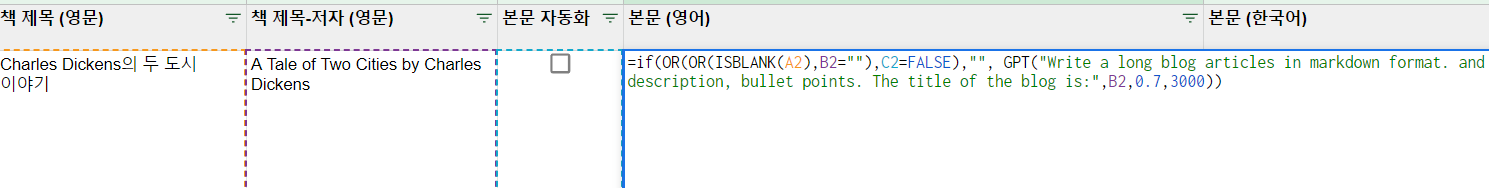 이런 생각이 들었다면 고수입니다. '이렇게 많은 거 언제 다하냐! 자동화할 수 없을까?" 물론 가능합니다. 이럴 때는 API를 이용해야겠지요. 파이썬으로 프로그램을 만들 수 도 있는데, 요즘 스프레트 시트에 GPT 확장 프로그램을 제공하더군요. 이걸 이용해 멀티로 작성하고 결과를 붙여 넣으면 금방 하겠죠.