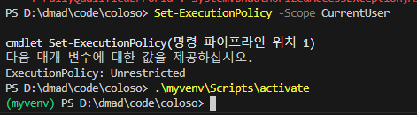 * 가상환경이 활성화 시 권한 에러가 발생할 경우 아래와 같이 조치한다. Unrestricted 권한을 부여한다.