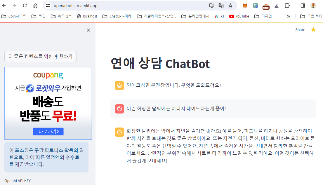 나만의 챗봇을 만들어 서비스할 수 있는 세상이다. 잘만든 봇하나가 웬만한 아르바이트보다 나은 수입을 가져다 줄지도 모른다. 여기에 사용된 기술을 잘 익혀서 응용한다면 분명 좋은 결과물을 가져올 수 있을 것이다. 앞으로 AI세상이 아니겠는가. 약간의 코딩을 이행하는 능력, 서비스를 제공하는 사이트, 홍보를 할 수 있는 사이트 그리고 이들을 하나의 서비스로 엮을 수 있는 능력이 필요한 세상이다.