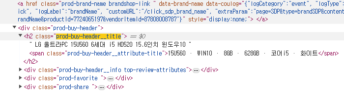 개발자 도구를 열어 상품명에 해당하는 클래스를 찾는다.