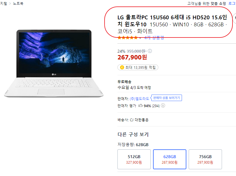 LG 울트라PC 15U560 6세대 i5 HD520 15.6인치 윈도우10 15U560 · WIN10 · 8GB · 628GB · 코어i5 · 화이트