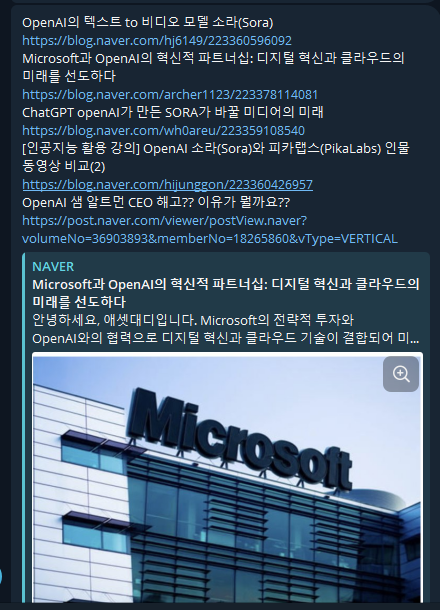 telegram 알림 창이 뜨면서, 내가 올린 글이 등록되었음을 확인할 수 있다.