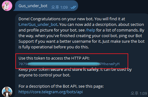 (4) Telegram API 확인 : HTTP API 확인하고 카피한다.