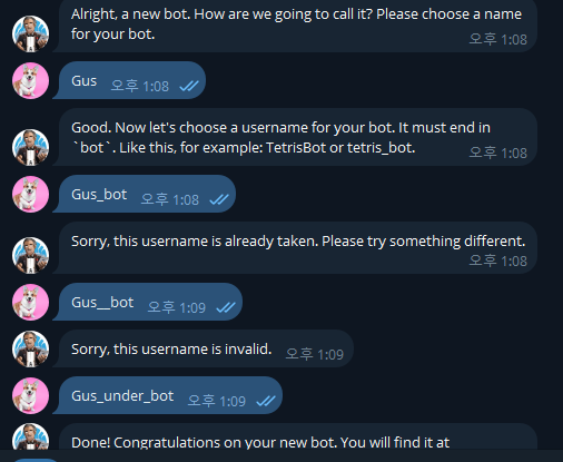 (3) bot 이름과 username을 입력한다. username은 'bot'으로 끝나야 하고 중복을 체크한다.