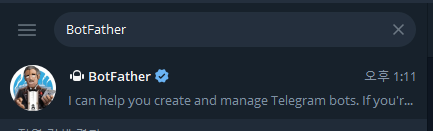 (1) Telegram에서 BotFather 검색한다. 짝퉁이 많으니 공식인지 확인한다. (파란색 둥근 체크박스)