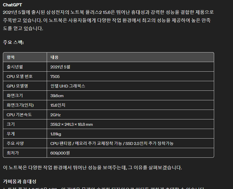 답변이다. 주요 스펙을 보기 좋게 표로 만들었다.