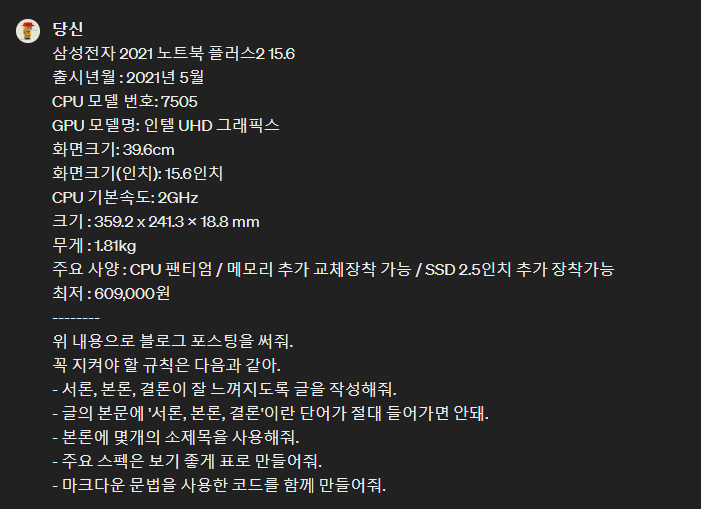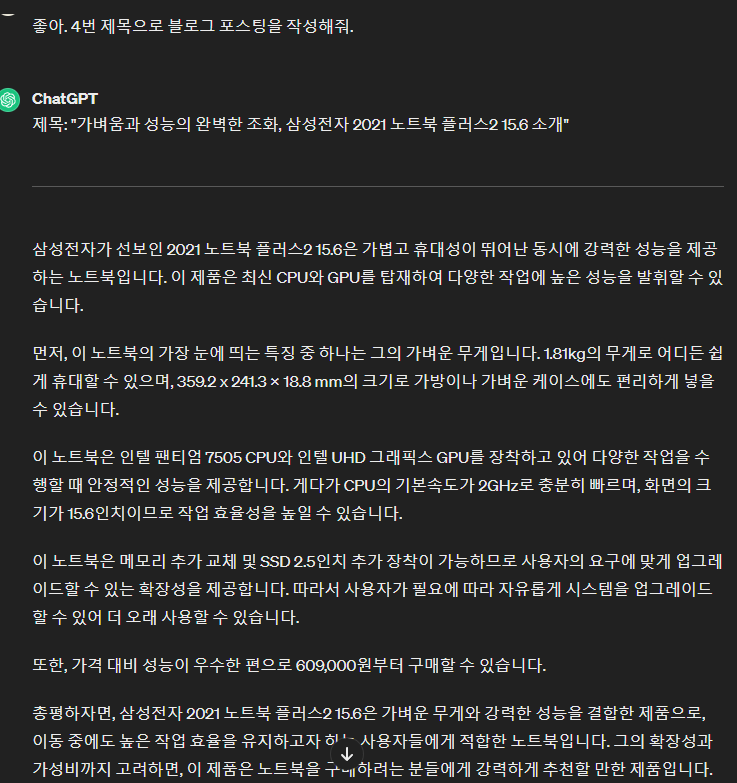 아직 다듬을 부분이 많다. 프롬프트 엔지니어링이라 할만큼 원하는 결과, 혹 할만한 카피문구를 작성하려면 많은 시간과 노력이 들어가야 한다. 언젠가 마치 사람이 쓴 건지 AI가 작성한 건지 구별을 못하는 시점이 올 거다. 일종의 튜닝 테스트를 통과할 때 이를 자동화하여 제휴 포스팅을 한다면 수익창출이 가능하지 않겠는가.