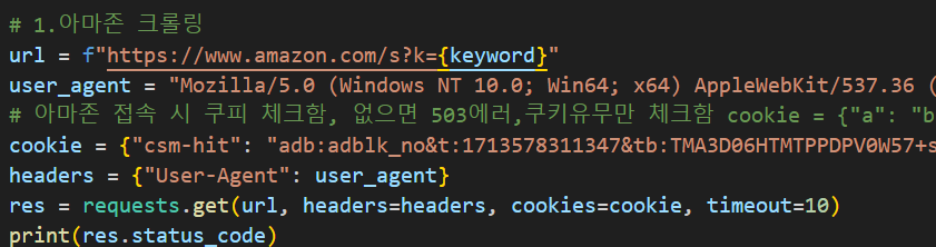 주의할 점은 반드시 cookie를 설정해야 한다. cookie 유무만 체크하기 때문에 cookie = {"a": "b"} 이런 식으로 입력을 해도 통과된다. 정확한 정보는 개발자모드에서 애플리케이션 - 쿠키 - csm-hit 값을 설정한다.