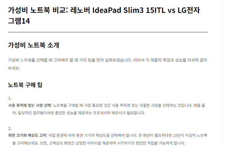 가성비 노트북 비교: 레노버 IdeaPad Slim3 15ITL vs LG전자 그램14가성비 노트북 소개가성비 노트북을 선택할 때 고려해야 할 몇 가지 팁을 먼저 살펴보겠습니다. 이어서 각 제품의 특징과 성능을 자세