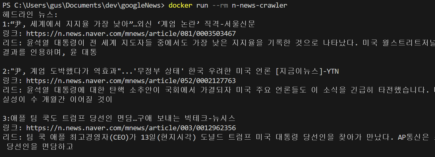 docker run --rm n-news-crawler # n-news-crawler를 도커에서 가져와 실행하고 완료되면 지운다.