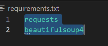requirements.txt 파일을 만들어 크롤링에 필요한 requests, beautifulsoup4를 추가한다.