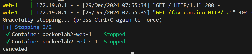 flask, redis 컨테이너만 stop 된다. 다시 서비스 기동 후 웹 사이트 접속하면 이전 카운트에 +1인 된다.