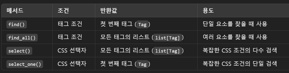 | find_all() | 태그 조건 | 모든 태그의 리스트 (list[Tag]) | 여러 요소를 찾을 때 사용 |